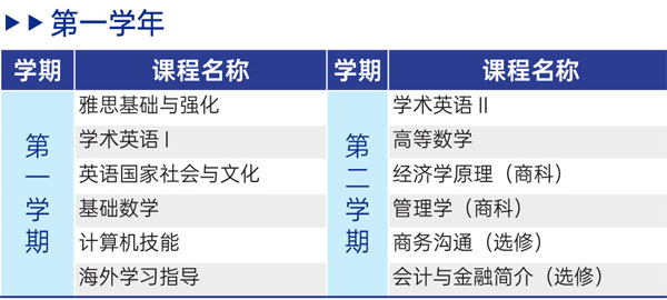 国际本科课程包含各为一年学制的两个教学阶段,总体目标是为学生进入国外大学完成后两年学习夯实知识与能力基础。大一阶段是一年制的英语国家大学预备课程,专为帮助中国高中毕业生升读海外知名大学设立,强调通识课程的学习、英语语言能力的提升、基础学术能力训练和跨文化交际能力的培养;大二阶段则在前一阶段的基础上,重点加强学科专业知识积累和国际学术能力提升,完成该课程可取得国际认可的相应证书。